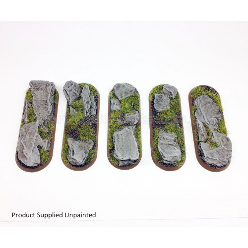 A set of 5 detailed 25mm x 70mm miniature bike style bases suitable for many of sci-fi wargames. These beautiful bases depict a sculpted rock/slate scene and are brilliant for adding the finishing touch to your miniatures both quickly and easily.